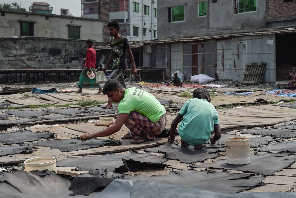 Tierkadaver, von denen die Haut für die Gerberei abgezogen werden, liegen gehäuft bei 38 Grad in der Sonne. Den Geruch kannst du dir dazu denken. Gefärbt wird das Leder mit Farbstoffen, welche ohne Mund- und Nasenschutz aufgesprüht werden. Bei glühender Hitze spannen Kinder und Jugendliche das Leder auf die Flachdächer.