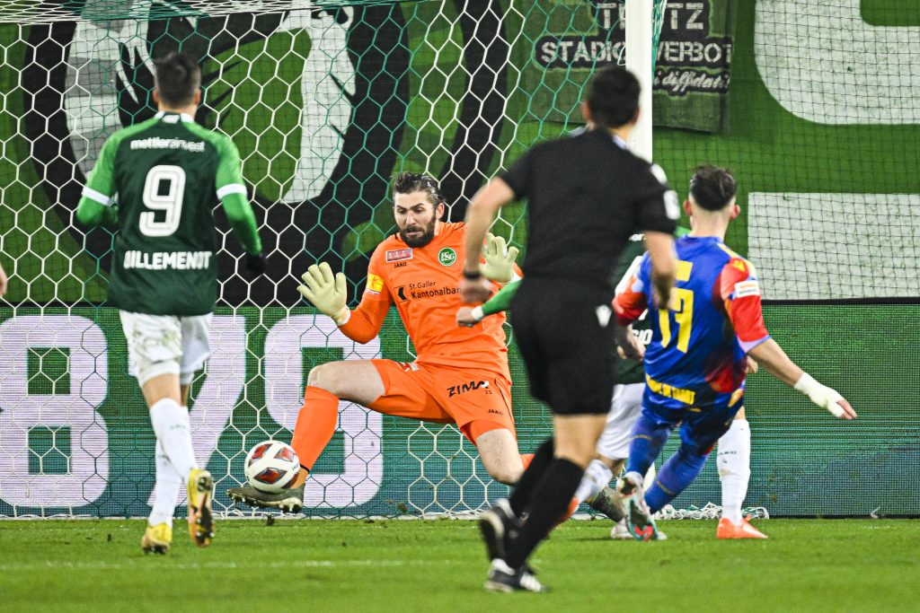 Rotblau hatten keinen optimalen Start erwischt. Die St. Galler gingen in der 10. Minute in Führung. Jordi Quintillà, der die Ostschweizer 2021 für ein halbjähriges Gastspiel beim FCB verlassen hatte und dann zurückkehrte, fand die Schnittstelle in der Basler Abwehr und passte in den Lauf von Christian Witzig. Dieser spielte quer in die Mitte, wo Jérémy Guillemenot genug Zeit und Platz genoss, um den Ball locker einzuschieben. Der Stürmer St. Gallens hatte – wie Amdouni – bereits in den beiden Meisterschaftsduellen zwischen den beiden Teams getroffen.