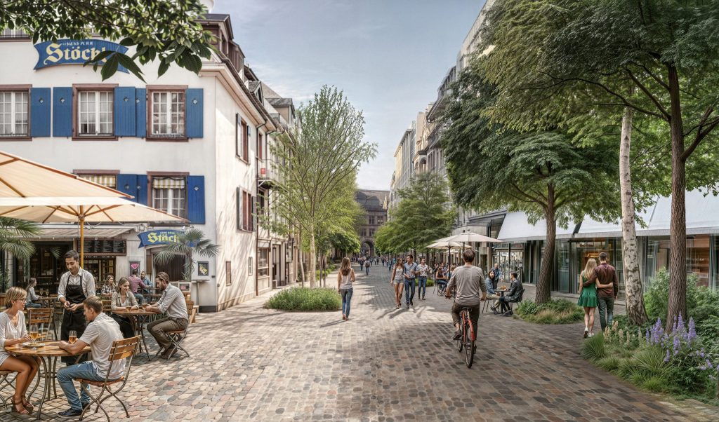Die Initiative «Go Basel Go» will die Basler Innenstadt in eine grüne Flaniermeile verwandeln. Zwischen Schifflände und Barfüsserplatz sollen keine Trams mehr fahren. Diese sollen laut Initiative die Innenstadt via Kohlenberg, Petersgraben oder Schifflände umfahren. Für Menschen mit eingeschränkter Mobilität schlagen die Initiant:innen einen Shuttlebus nach dem Vorbild Dijon vor.