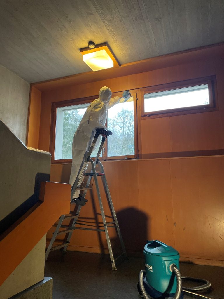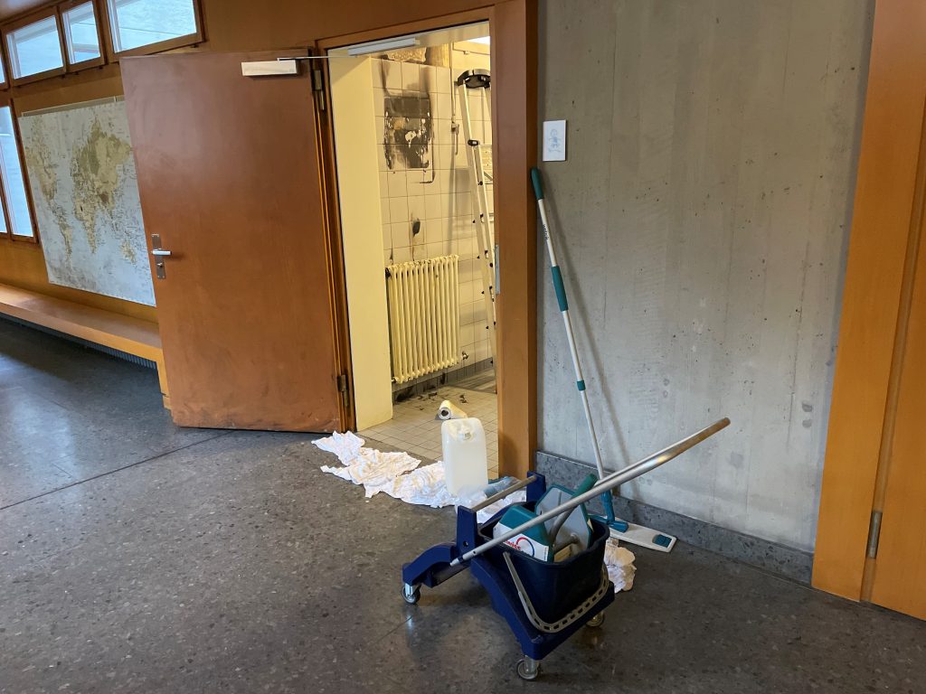Das in der Toilette gelegte Feuer hat eine enorme Rauchentwicklung ausgelöst. Die WC-Lüftung hat die Verteilung des Rauches unterstützt, sodass das Gebäude vom Erdgeschoss bis in den fünften Stock verschmutzt wurde. Seit Mittwoch ist daher ein 16-köpfiges Team einer Brandschadensanierungsfirma mit der Reinigung beschäftigt. Ab Montag dürfen die Klassen der ersten zwei Stöcke wieder ins Gebäude. Im Laufe der nächsten zwei Wochen werden der dritte und vierte Stock gereinigt und wieder in Betrieb genommen. Der gesamte Reinigungsprozess dauert voraussichtlich bis Ende Fasnachtsferien. Während der Ferienzeit widmet sich das Reinigungsunternehmen den Lüftungsrohren.