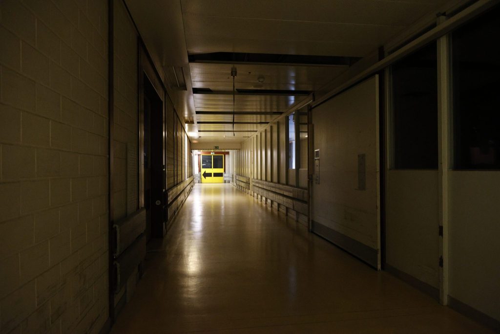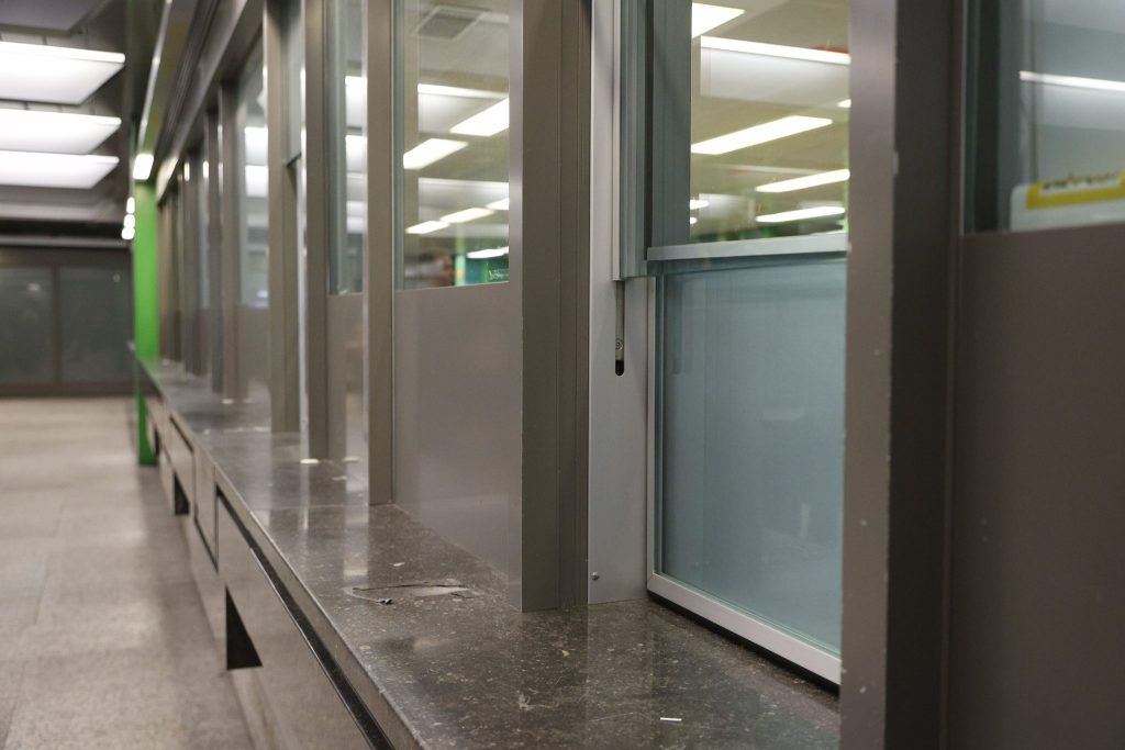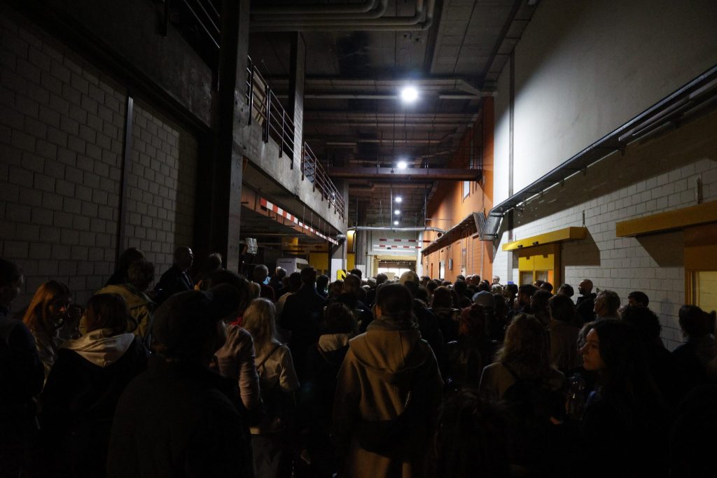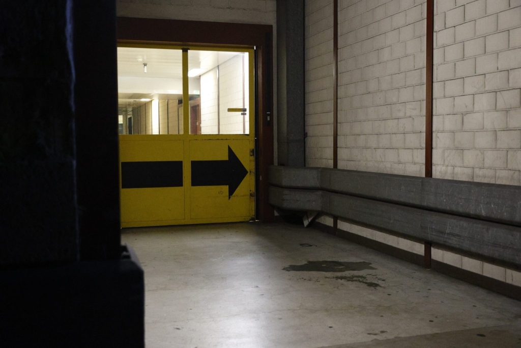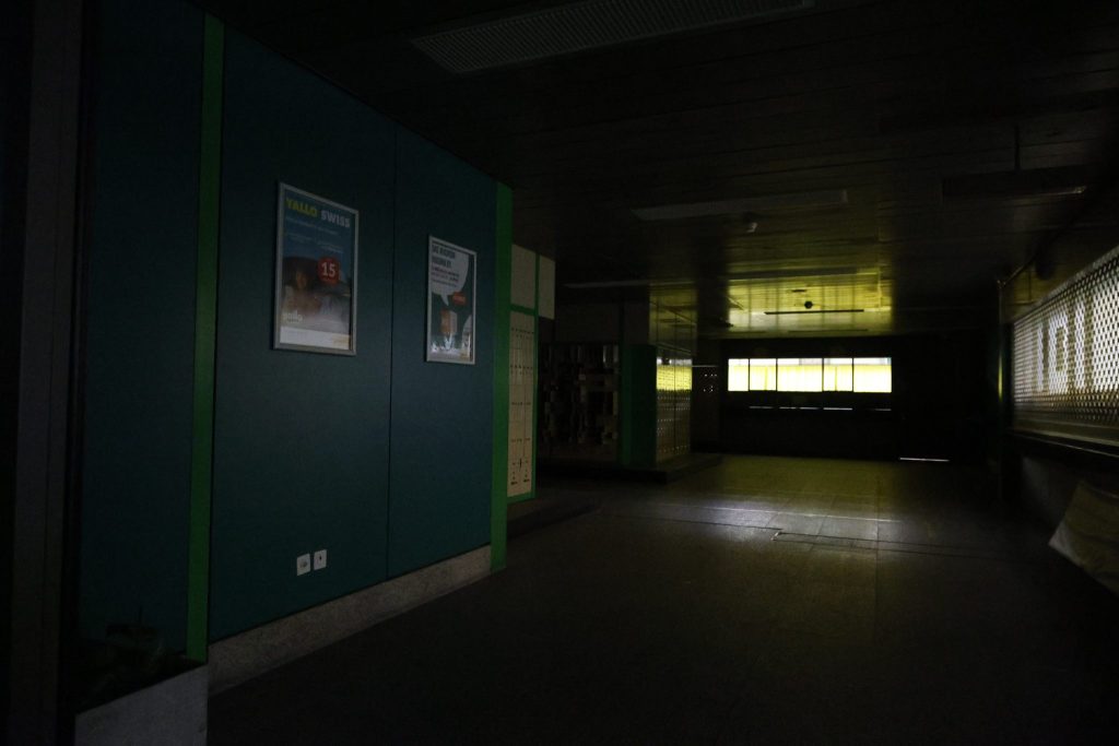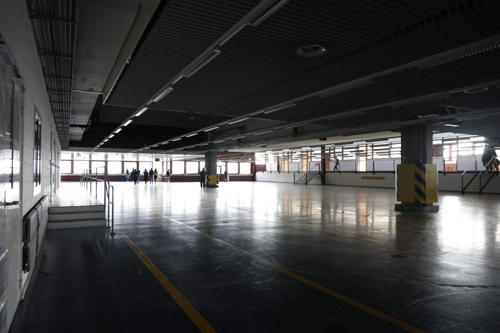 Die Führung beginnt bei den alten Postschaltern. Grau, etwas Grün, leicht trist – doch der Raum ist gefüllt mit Besucherinnen und Besuchern. Durch das Treppenhaus mit gelben Aufzügen, einem auffälligen Farbtupfer im grauen Gebäude, geht es hinauf zur Galerie. Eine weitere Treppe führt in einen langen, sterilen Gang, der an ein Spital erinnert. Dahinter liegen die ehemaligen Büroräume. Die Räume sind leergeräumt, grau und wirken verlassen.