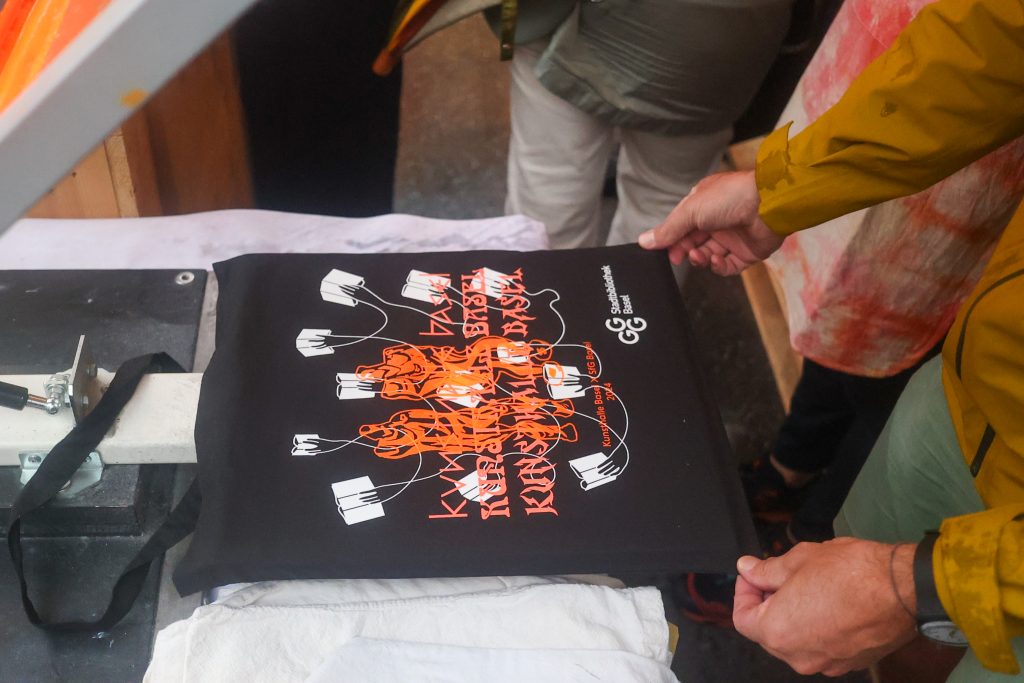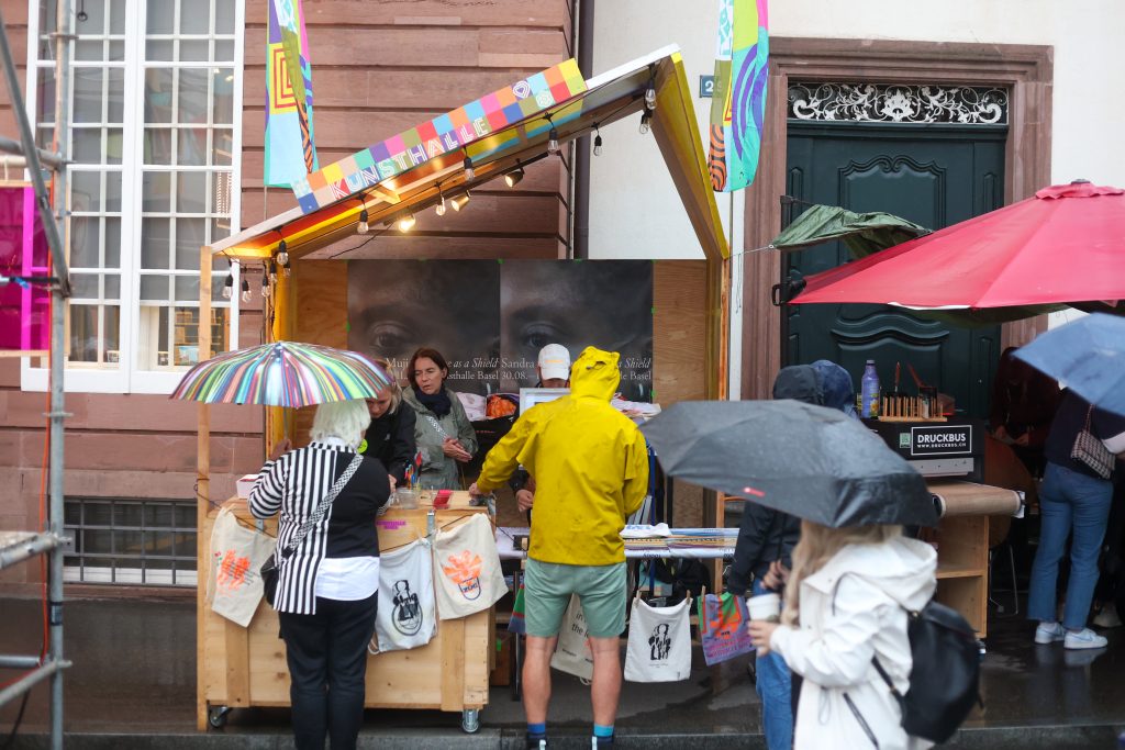Gerade eine Zuckerwatte geholt, aber ihr wollt sie erst später geniessen? Dann ab in die Tasche damit (Anm. d. Red.: nicht empfohlen). Und diese Tasche gibt es am Stand der Kunsthalle. Hier könnt ihr ausgewählte Motive entweder temporär auf den Arm tätowieren lassen oder per Siebdruck auf einen Beutel oder ein T-Shirt drucken. Die Motive wurden von Schüler:innen der Schule für Gestaltung entworfen. Inspiriert sind sie von der aktuellen Ausstellung «Time as a Shield» der Kunsthalle Basel.