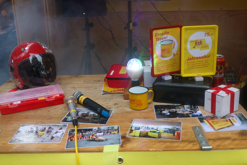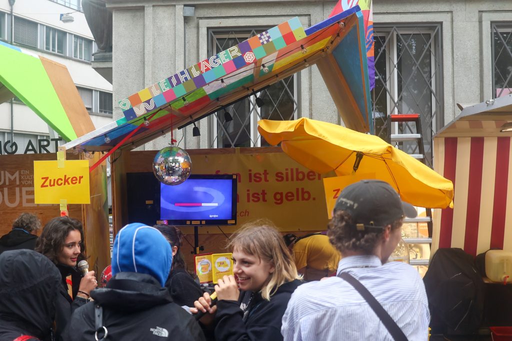 Das war lecker, wir fühlen uns nun aber etwas träge, denn der Burger sitzt noch schwer im Magen. Optimal: Nur ein paar Meter weiter hat das Leihlager Basel seinen Stand am Flâneur Festival. Hier kann man die Kalorien tanzend bei einem Karaoke-Song loswerden. Schritt 1: Wähle ein Lied. Schritt 2: Nimm dir ein Mikrofon. Schritt 3: Singe und tanze unter der Diskokugel zu deinem Lieblingshit. Das gesamte Material, das hier verwendet wird, kann beim Leihlager an der Horburgstrasse ausgeliehen werden. Das Jahresabo für 75 Franken kann man gleich hier abschliessen. Wer nach dem Tanzen noch ein kleines Dessert braucht, bekommt hier übrigens süsse Zuckerwatte. Ihr ahnt es: Auch die Zuckerwattemaschine kann bei Bedarf ausgeliehen werden.