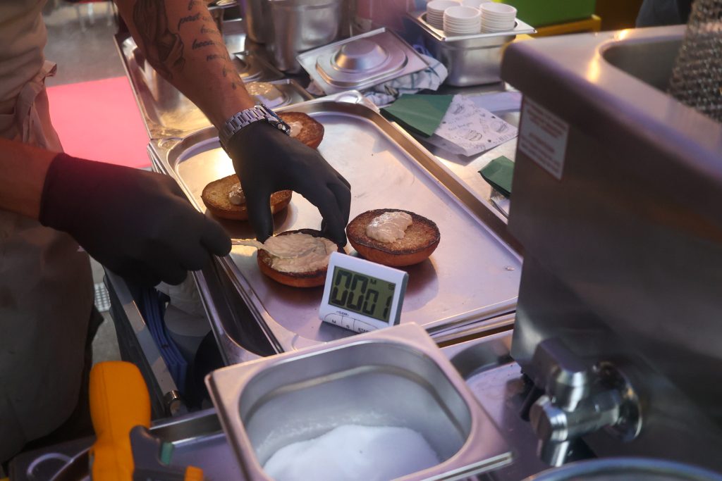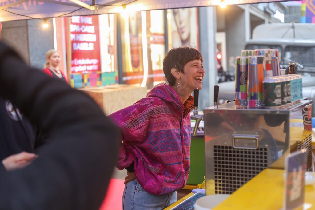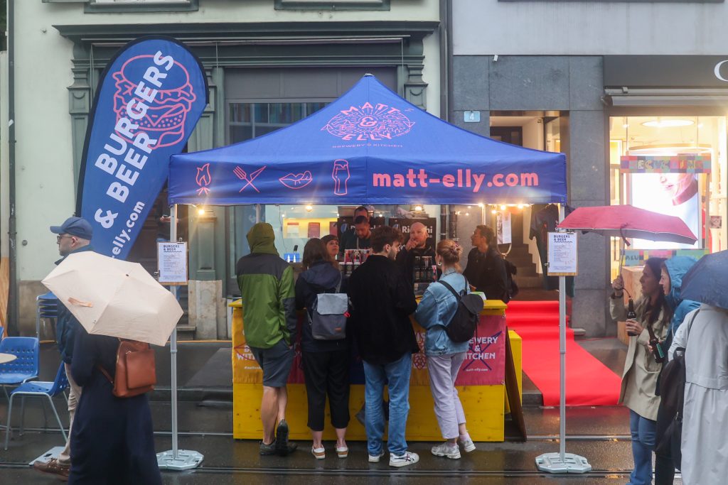 Der Start unserer Route befindet sich direkt am Bankverein. Der Tag war lang, der Hunger gross. Deshalb gibt es bei Matt & Elly einen ‚Swiss Beef Cheese Burger‘. Auch eine vegetarische Variante wird angeboten. Das Restaurant und die Brauerei haben ihren Standort im Erlenmatt-Quartier und sind bereits zum fünften Mal beim Flâneur Festival dabei, erzählt Betriebsleiterin Denise Furter. Zu einem Rindfleisch-Burger empfiehlt sie ein leichtes Sauerbier mit Pfirsich.
