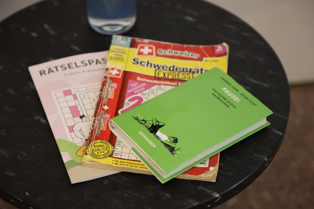 Zudem wird es am Samstag im Foyer vor dem Soft Space einen Tisch geben, an dem Kleidungsstücke geflickt werden. Momentan liegt dort ein Puzzle auf. Auch das soll zur Entspannung anregen. Genauso wie Bücher, die sich mit dem Thema Pause auseinandersetzen.