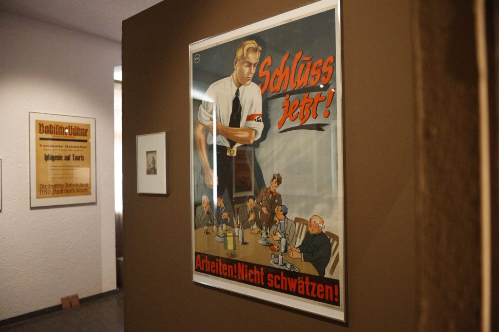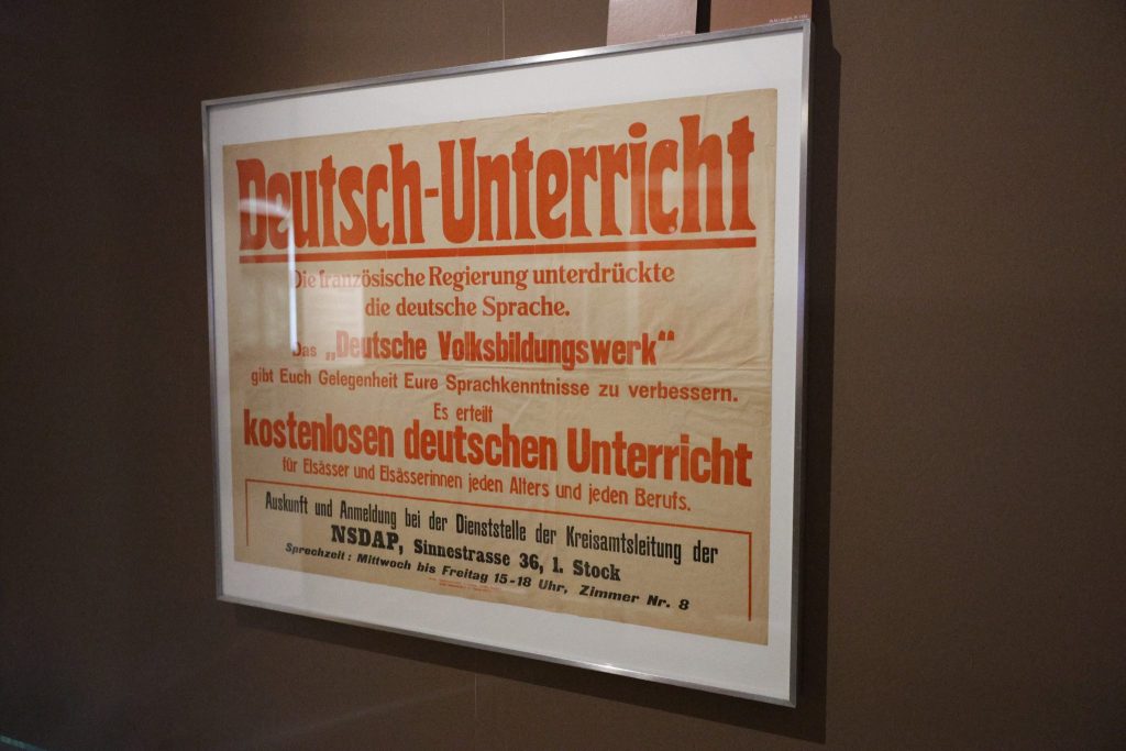 Die französische Sprache wurde verboten, stattdessen gab es Deutschunterricht. Jugendliche mussten sich NS-Jugendorganisationen anschliessen. Französische Bücher, Zeitungen oder Plakate verschwanden, Strassen wurden umbenannt. «Anders als in anderen Gebieten hat man die Germanisierungspolitik im Elsass ganz vehement vorangetrieben», erklärt Merk. Für die damalige Bevölkerung ein brutaler Verlust der eigenen Identität. Wer sich der Germanisierung widersetzte, wurde verhaftet, deportiert oder ausgewiesen. In der Ausstellung zeugen zahlreiche Exponate von der Zwangsgermanisierung und der Vorgehensweise der Nationalsozialisten im damaligen Elsass.