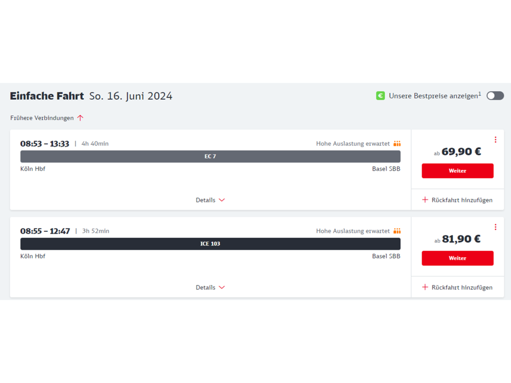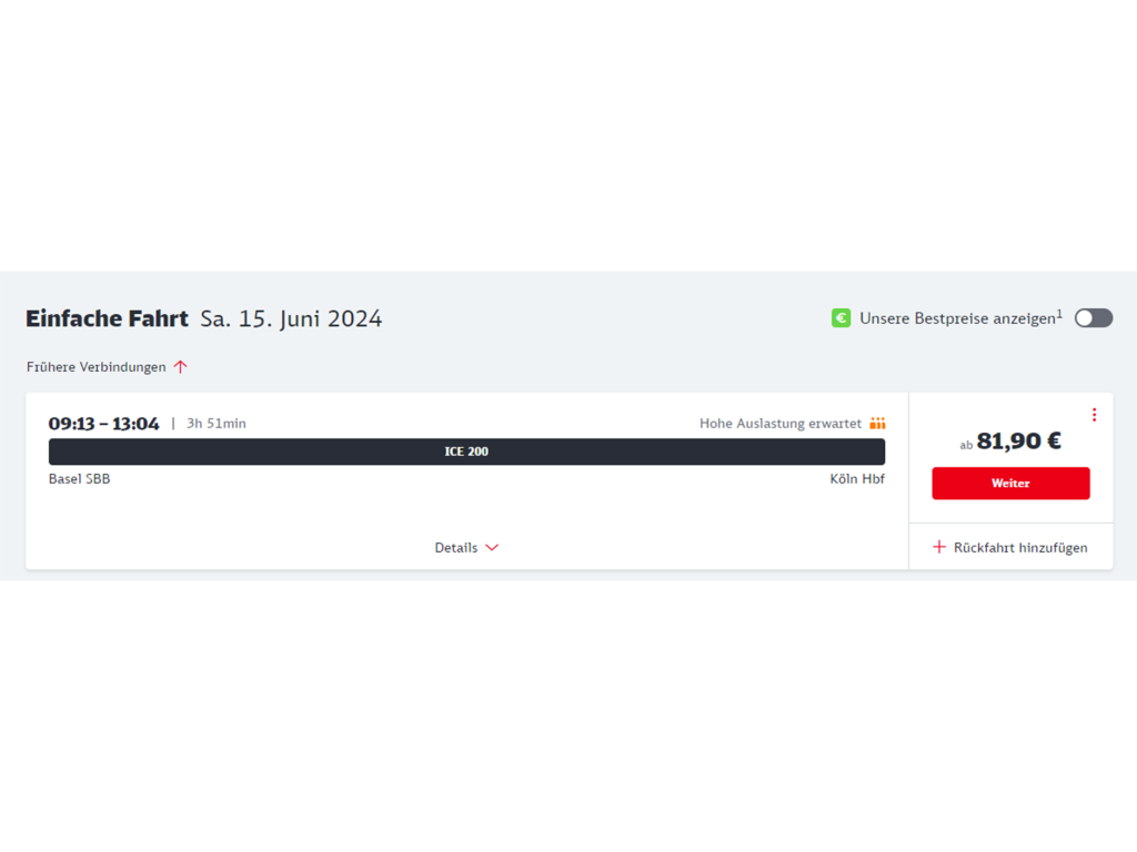 Doch auch die Abfahrtszeit des Zuges nach Köln am 15.06.2024 (erstes Gruppenspiel der Schweiz) wirft Fragen auf. Der Zug fährt um 3 Uhr in der Nacht los. Warum diese ungewöhnliche Abfahrtszeit? An den Spieltagen gibt es mehrere direkte Verbindungen zu angenehmeren Abfahrtszeiten und zu besseren Preisen.