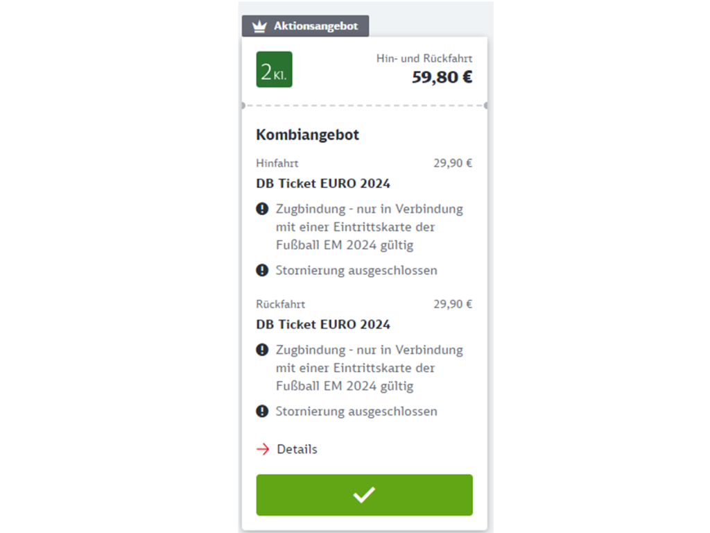 Eine kurze Recherche auf herkömmlichen Internetseiten zeigt jedoch, dass eine direkte Verbindung von Basel nach Köln fast halb so viel kostet. Zudem bietet die Deutsche Bahn ein spezielles EM-Angebot für alle Fans mit einem Match-Ticket an. Mit diesem Angebot kann man für nur 30 Euro pro Weg an den jeweiligen Austragungsort fahren. Eine direkte Verbindung für Hin- und Rückfahrt kostet hierbei also lediglich 60 Euro.