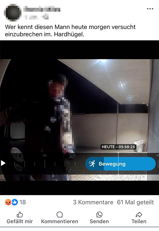 Wer Aufnahmen von Überwachungskameras nutzt, um etwa dreiste «Pägglidiebe» oder ähnliche Delikte zu entlarven, bewegt sich auf heiklem Terrain. Immer wieder teilen Privatpersonen solche Aufnahmen von Tätern oder mutmasslichen Einbrechern in sozialen Netzwerken – offenbar ohne sich der möglichen rechtlichen Konsequenzen bewusst zu sein. Dies zeigen folgende Beispiele aus Allschwil, Birsfelden oder Büren.