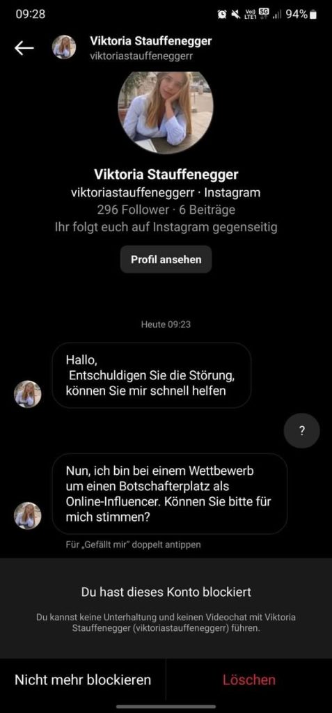 Der Schreibstil passt nicht zu einer Person: Die Person schreibt dich plötzlich auf Hochdeutsch oder Englisch an, obwohl ihr normalerweise auf Schweizerdeutsch schreibt. Wenige Follower:innen: Der Account hat nur wenige oder gar keine Follower:innen, aber folgt selbst vielen Profilen.
