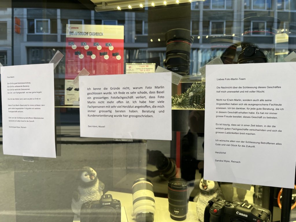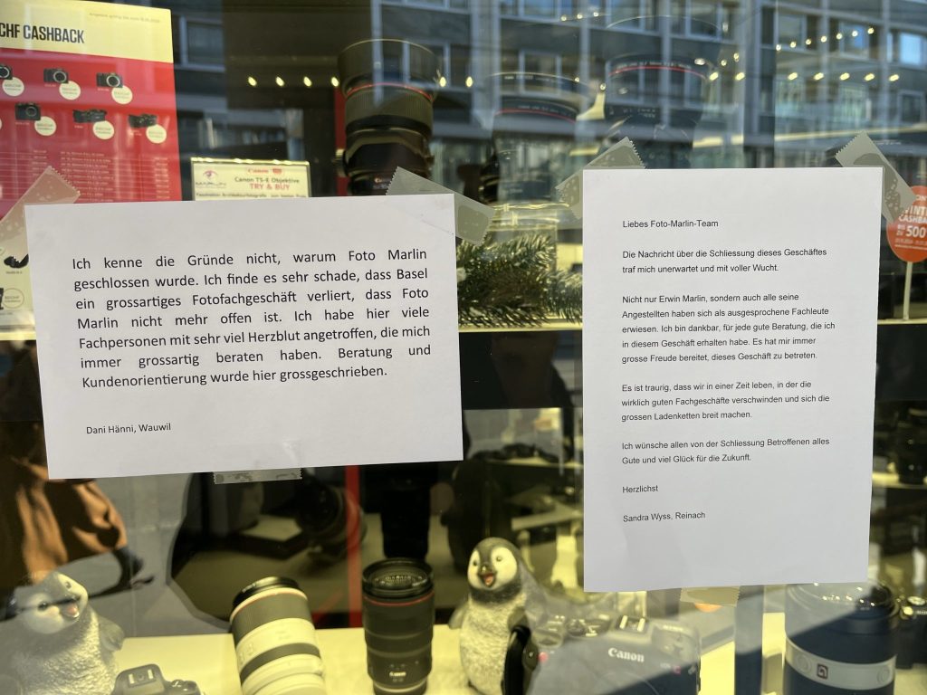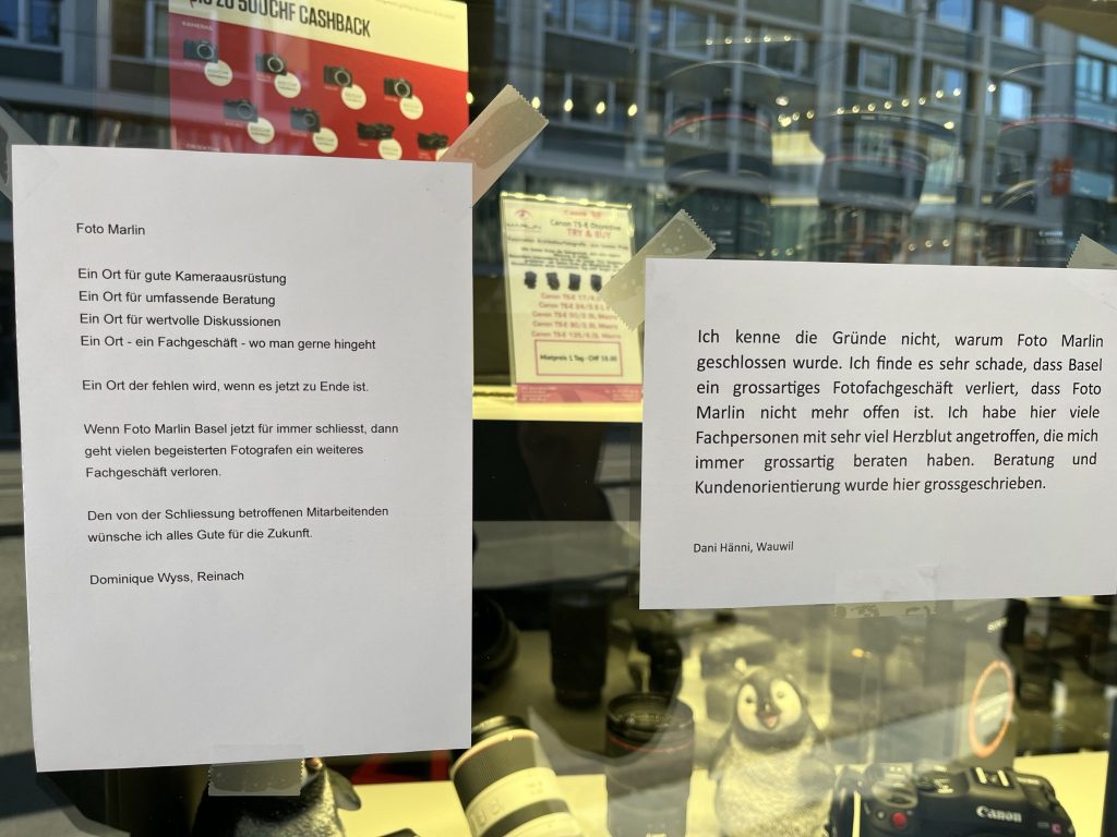 Auch vor Ort haben Stammkunden ihr Bedauern kund getan. Mit Zetteln an der Fensterscheibe bedanken sich die Kunden für die professionelle Beratung. So schreibt zum Beispiel Dominique Wyss aus Reinach: «Ein Ort für gute Kameraausrüstung. Ein Ort für umfassende Beratung. Ein Ort für wertvolle Diskussionen. Ein Ort – ein Fachgeschäft – wo man gerne hingeht. Ein Ort, der fehlen wird, wenn es den jetzt zu Ende ist.»