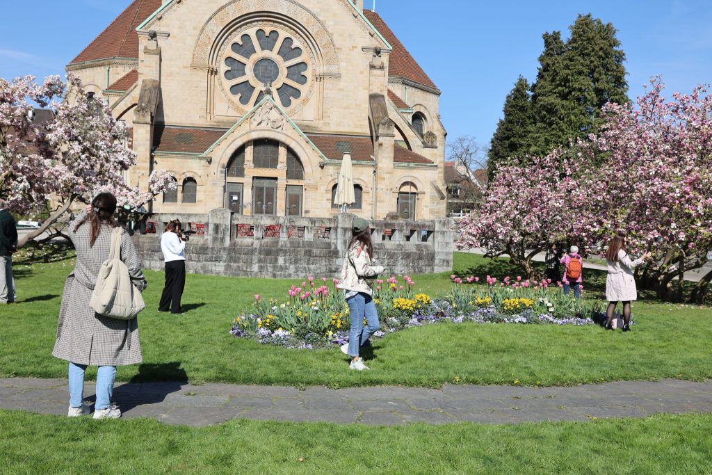 Auf der Jagd nach dem ultimativen Frühlingsfoto winden sich Influencer und Hobbyfotografen durch die Äste der Magnolien im Garten der Pauluskirche – sehr zum Leid der blühenden Bäume.