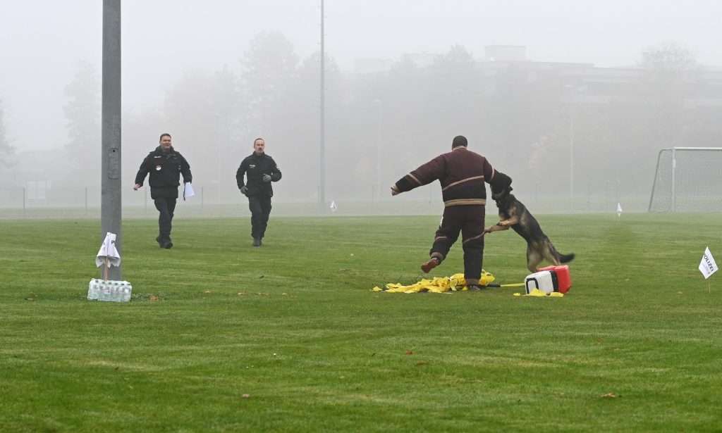 «Stehen bleiben, sonst schicke ich den Hund!», hallt es am Freitagmorgen über die Sportanlage Löhrenacker in Aesch. Dann rennt Devil los. Er packt den Angreifer am Arm und beisst sich fest. Sein Kiefer lässt nicht los, bis Hundeführerin Carola Casanova ihren Hund zurückruft.