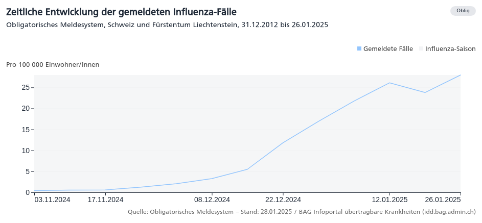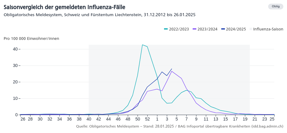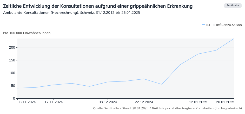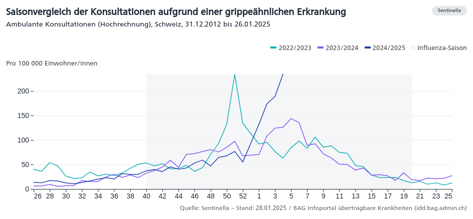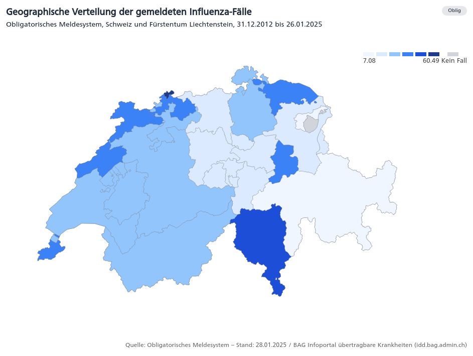 In der vergangenen Woche wurden schweizweit durchschnittlich 28 Influenza-Fälle pro 100’000 Einwohner registriert. Dies ist ein Anstieg gegenüber dem Vorjahr, als der Spitzenwert bei durchschnittlich 26,5 Fällen pro 100’000 Einwohner lag. Die Zahl der gemeldeten Fälle variiert stark von Kanton zu Kanton. Der Kanton Basel-Stadt weist mit 60 gemeldeten Grippefällen die höchste Zahl auf, gefolgt vom Tessin mit 50 Fällen. In der letzten Januarwoche seien vor allem die Zahlen zu Arztbesuchen aufgrund von Grippesymptomen stark gestiegen, aus den Daten des Bundes ersichtlich werden.