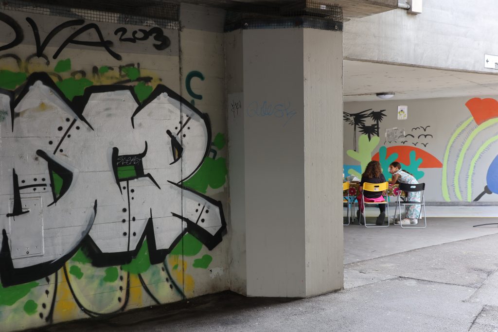 Pinsel, Farbtöpfe, eine Leiter und eine nur noch halbleere Wand. Davor ein Tisch mit Essen, Trinken, Musik und diversen Vorlagen für Motive an der Wand. Das war am Donnerstagnachmittag alles unter der Schwarzwaldbrücke anzutreffen. Dazu einige Kinder, die fleissig die Pinsel und Stifte schwangen und drei Erwachsene von der Mobilen Jugendarbeit Basel. Sie leiteten die Kinder an und beaufsichtigten sie beim Bemalen der Betonmauer.