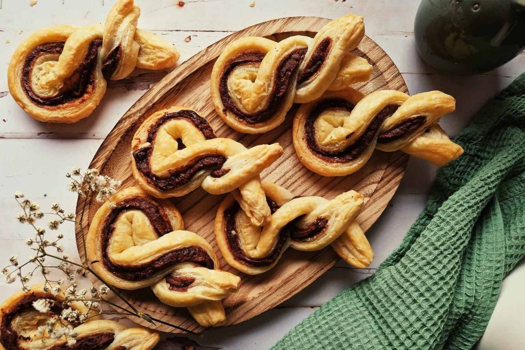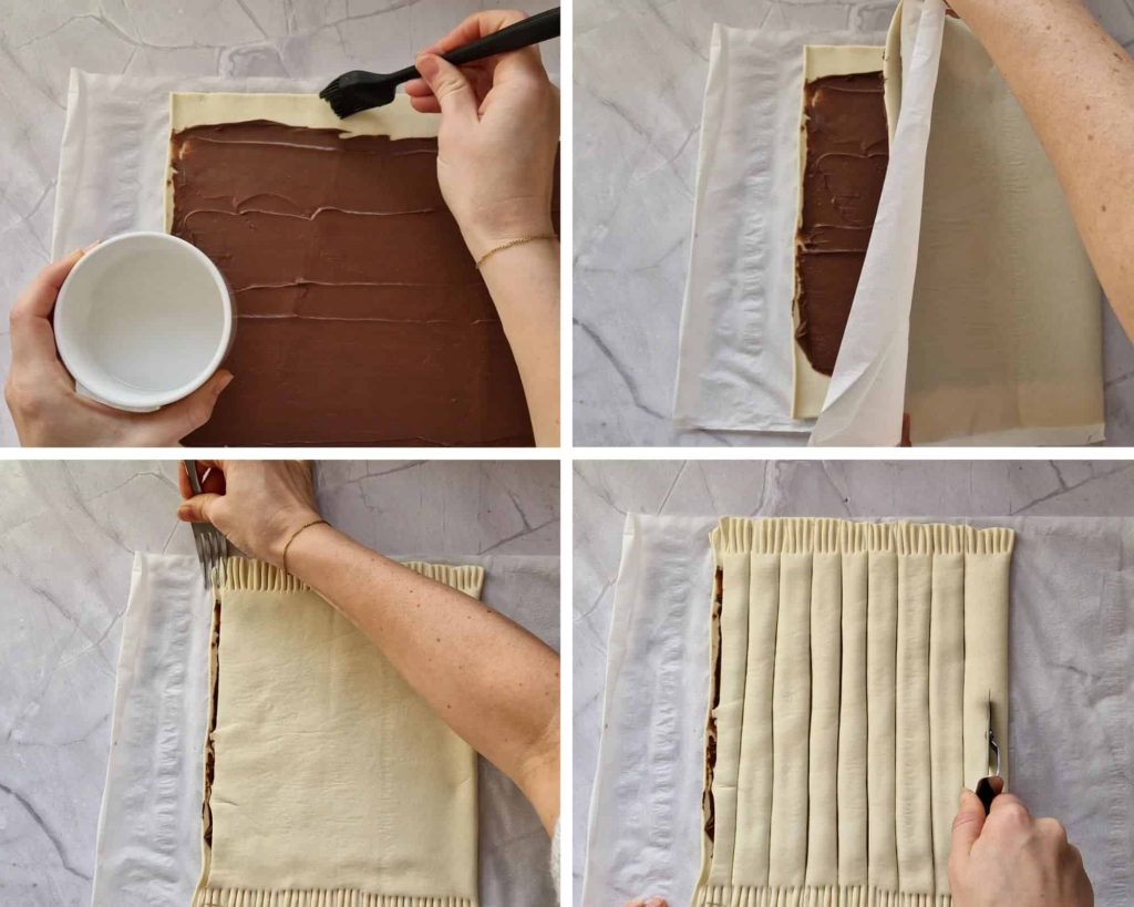- Blätterteig mit Nutella oder einer anderen Füllung bestreichen und dabei unten und oben einen Rand frei lassen.