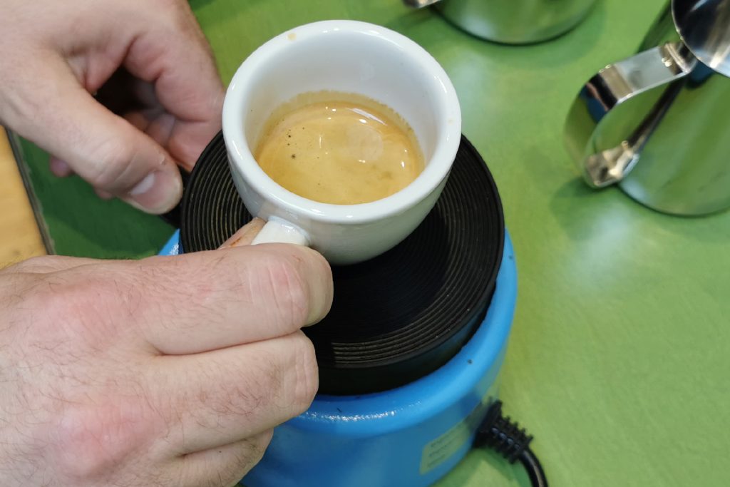 Beim Probieren hat Hohlmann festgestellt, dass der Espresso von der Vibrationsplatte besser schmecke als der normal mit dem Löffel gerührte. «Das Wahrgenommene im Mund verändert sich damit.» Denn die Kaffeeteilchen im Wasser werden durch die Vibration umgeschichtet, erklärt der Barista-Meister.