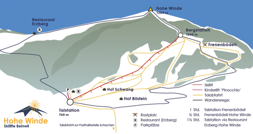 - Das Skigebiet in Beinwil hat einen Doppelbügellift, der auf 1060 M.ü.M fährt