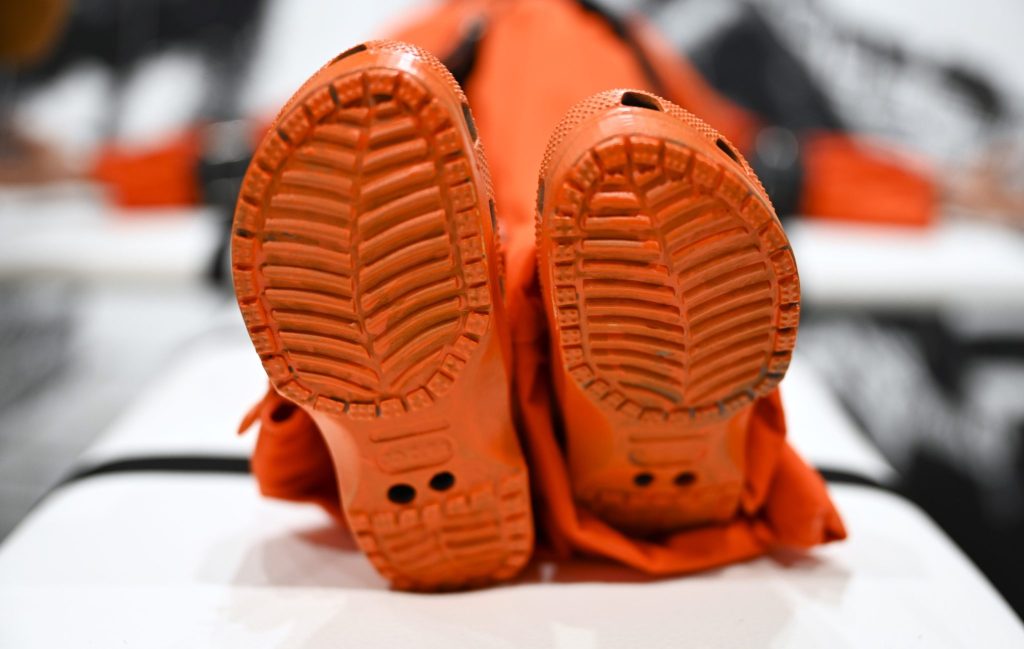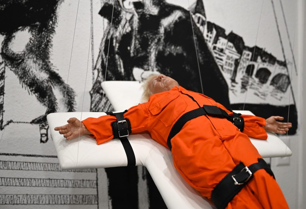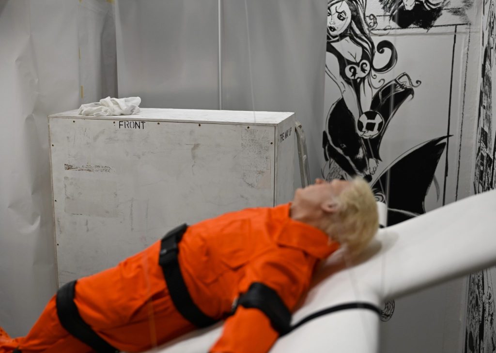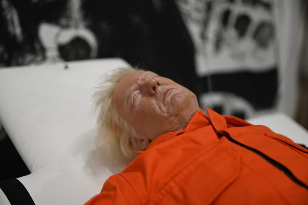 Die Frage ist auch der Grund, warum das Werk in einem 45 Grad Winkel hängt. «Hätten wir ihn aufrecht gehängt, wäre er ein Heiliger gewesen», sagt Breznik. Die Assoziation zum gekreuzigten Trump liege dann nahe. «Wäre er waagerecht, dann wäre die Interpretation zum Verurteilten nahe», erklärt er weiter. Trump ist im Kunstwerk in US-amerikanischer Gefängniskleidung an ein Kreuz geschnallt. Das Kreuz und die Schnallen erinnern an das Bett, auf dem zum Tode verurteilte Häftlinge in den USA die tödliche Spritze verabreicht bekommen. «Hätten wir ihn senkrecht oder waagerecht positioniert, hätten wir eine Vorverurteilung vorgenommen», sagt Konrad Breznik. Diese Entscheidung sollten Betrachtende aber selbst vornehmen.