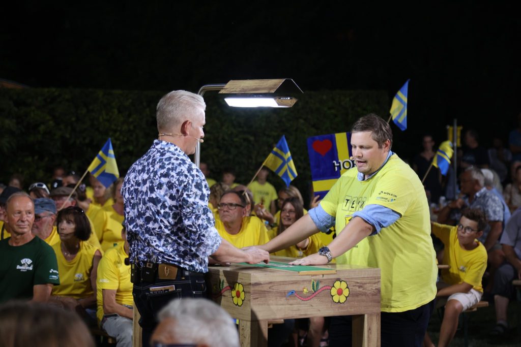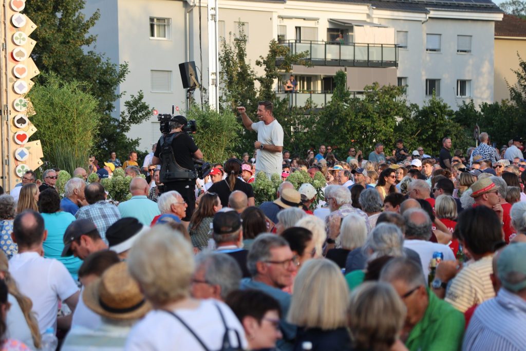 Nach Therwil im Jahr 2023 ist nun also wieder einmal die Region Basel an der Reihe, und die Jass-Schweiz blickt nach Oberwil. Vor einer eindrücklichen Kulisse und bei glühenden 36 Grad moderiert Rainer Maria Salzgeber durch die Show. Und der SRF-Mann weiss bereits im Vorfeld am Telebasel-Mikrofon: «Man muss nur in die Runde schauen, was hier stimmungsmässig abgeht. Das wird wieder ein gigantischer Jass-Abend werden!»