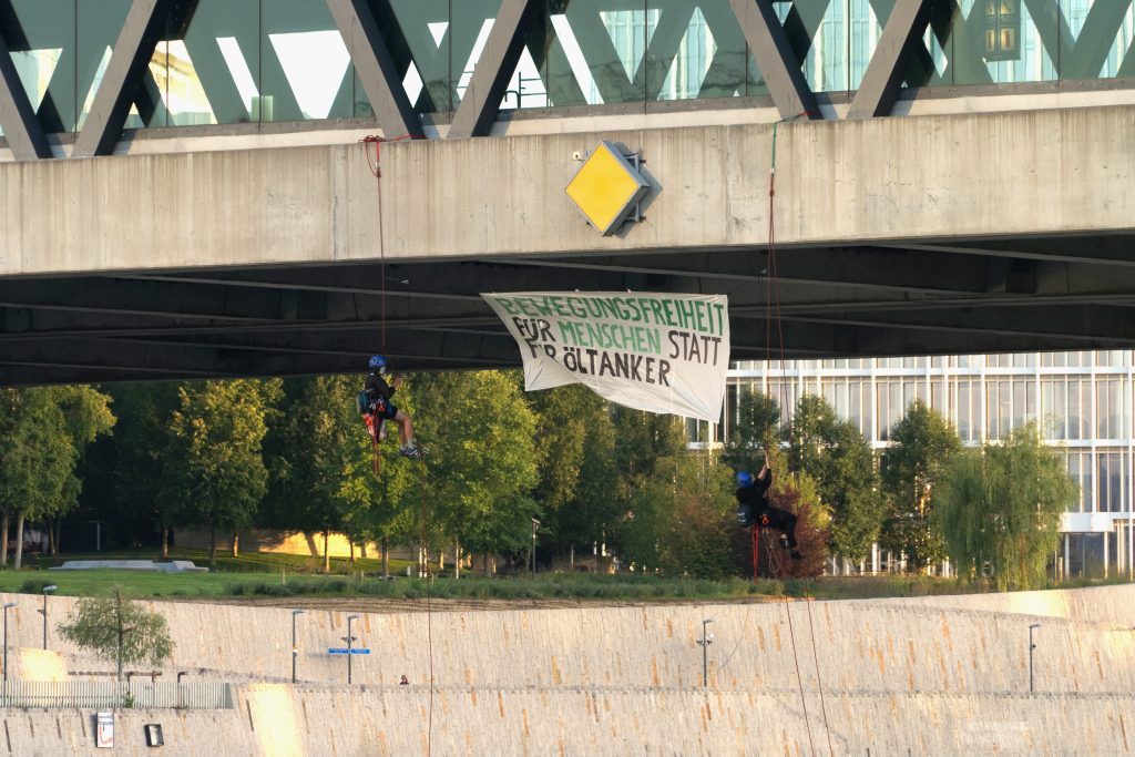 Die Aktivist:innen befestigten zwei Transparente, eines mit der Aufschrift «Bewegungsfreiheit für Menschen statt für Öltanker» und ein Stoppsignal mit der Aufschrift «Kolonial». Geplant war laut Aussage von Anwesenden, dass sich mehrere Personen abseilen sollten, während andere im Wasser schwammen. Insgesamt waren ungefähr zehn Personen an der Aktion beteiligt.