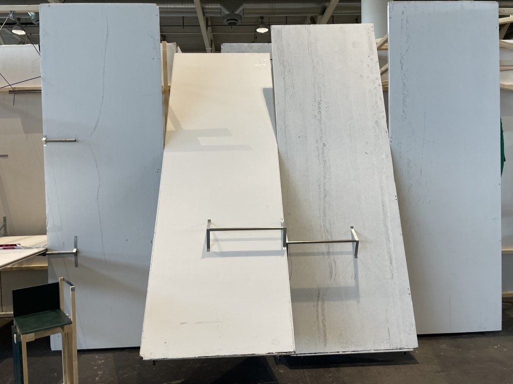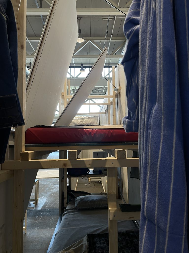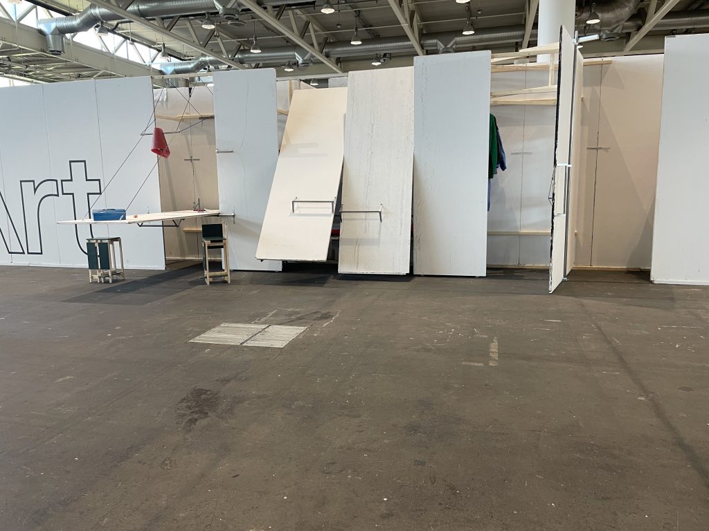 Bei den Swiss Art Awards werden jeweils zwei Spezialprojekte von letztjährigen Gewinner:innen umgesetzt. Eines davon nennt sich Gum gum und stammt vom Lausanner Architekturbüro detritus. Inspiriert von den extrem hohen Unterkunftspreisen in Basel während der Art, haben die beiden Architekt:innen Claire Logoz und Bastian Marzoli Unterkünfte im Ausstellungsraum entworfen, die während des Tages unsichtbar werden.