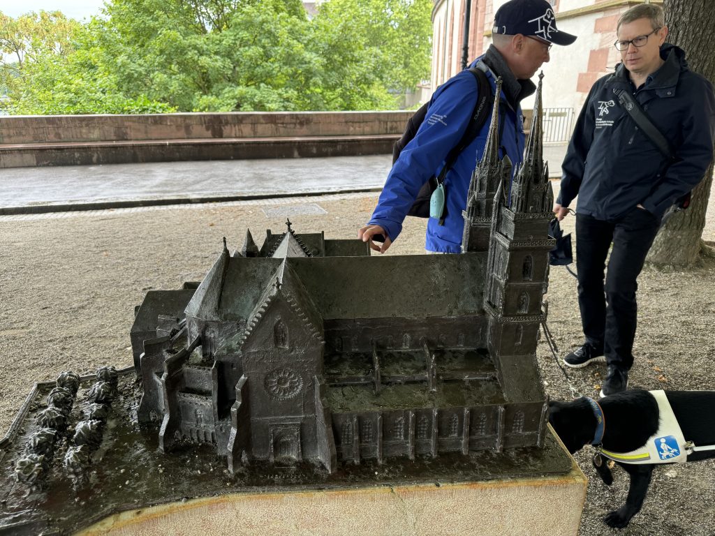 In der Pfalz angekommen zeigt Ronny Ramseier auf das Miniaturmodell des Basler Münsters. Das Modell wurde von Blinden-Stadtmodelle gebaut und soll blinden und sehbehinderten Menschen ermöglichen, das Münster zu ertasten, um ein Gefühl für das Aussehen des Gebäudes zu bekommen.