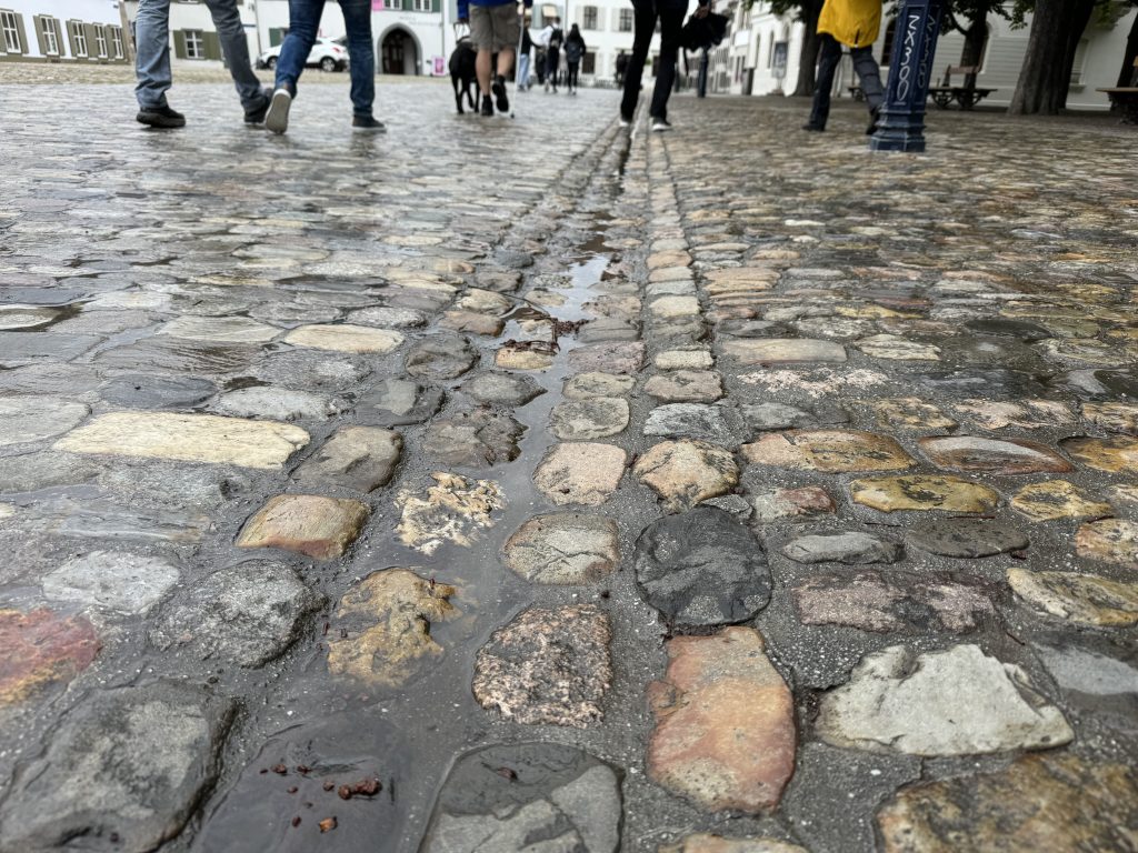 Zurück auf dem Münsterplatz zeigt Ramseier auf die Regenrinne. Diese dient auch Sehbehinderten als ideale Leitlinie. Es müssten nicht immer die klassischen weissen Leitlinien sein, wie man sie zum Beispiel vom Bahnhof SBB kennt, meint Ramseier. Allerdings endet die Regenrinne mitten auf dem Platz.