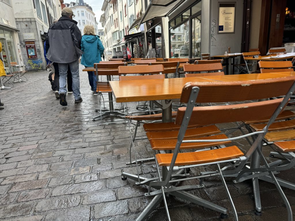 Weiter geht die Führung durch die Gerbergasse. Diese verfügt links und rechts über Regenrinnen, die sich auch ideal als Leitlinien anbieten. Allerdings zeigt sich da bereits das nächste Problem. Auf den Regenrinnen stehen zum Teil Schilder, Tische oder Stühle der Restaurants und Cafés. «Ohne Blindenführhund würde ich da wohl immer in die Objekte laufen», meint Ramseier mit einem Schmunzeln.